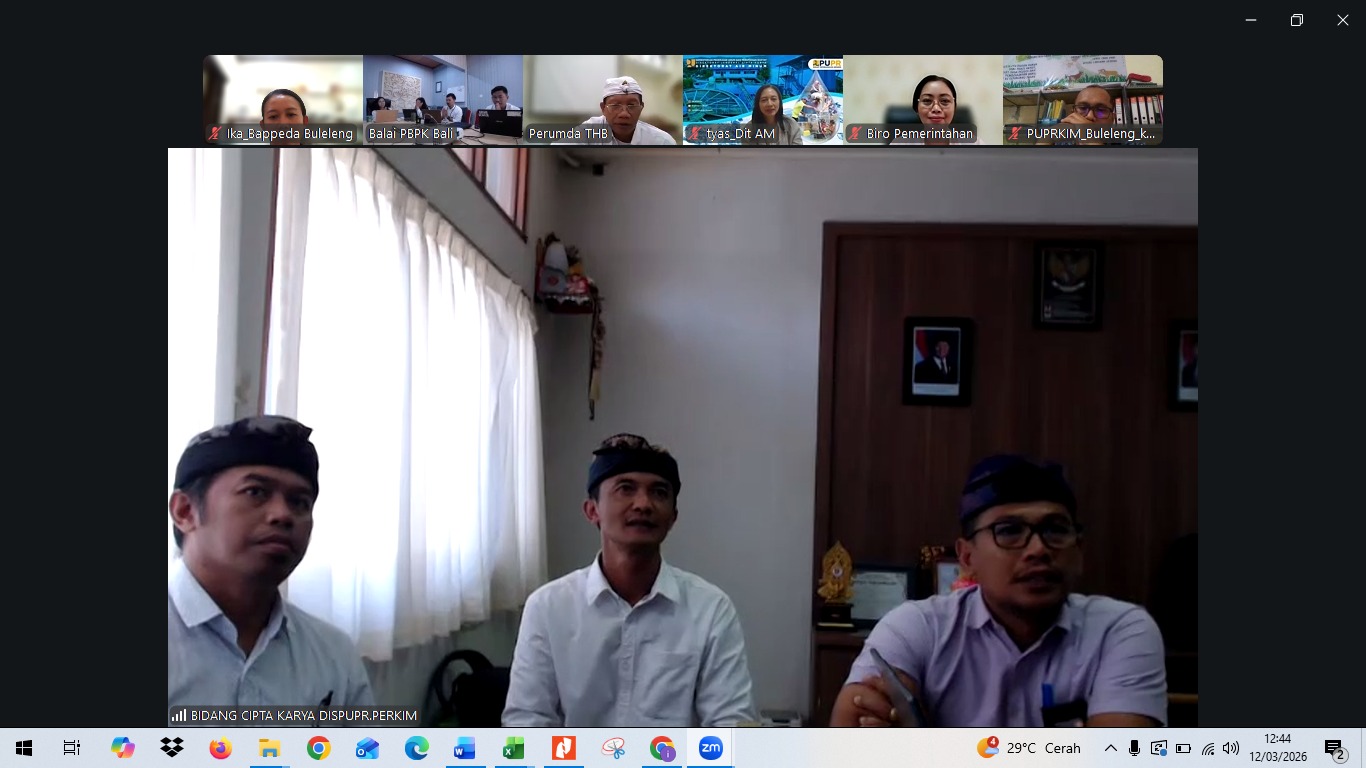 Staf Bidang Perekonomian, SDA, dan Infrastruktur Bappeda Kabupaten Buleleng, Ika Damayaniti, mengikuti rapat koordinasi (rakor) terkait perpanjangan Nota Kesepakatan (NK) Penyelenggaraan SPAM Regional Burana yang dilaksanakan secara daring melalui Zoom Meeting. Rapat ini diselenggarakan oleh Dinas PUPRKim Provinsi Bali dan dihadiri oleh berbagai pihak terkait, antara lain perwakilan Direktorat Air Minum Kementerian PU, BPBPK Bali, Balai Wilayah Sungai, Biro Pemerintahan Setda Provinsi Bali, Bappeda dan Dinas PUPRKim Kabupaten Buleleng, Bappeda dan Dinas PU Kabupaten Jembrana, serta Perumda Air Minum Kabupaten Buleleng dan Jembrana.